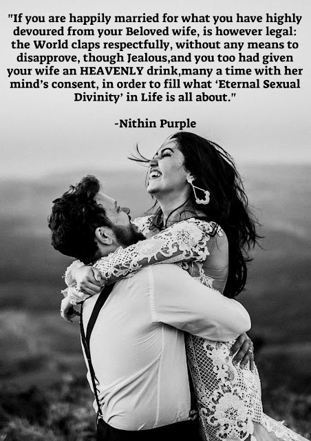 "If you are happily married for what you have highly devoured from your Beloved wife, is however legal: (comparing the formal,that makes you a bit notorious),the World claps respectfully, without any means to disapprove though Jealous,and you too had given your wife an HEAVENLY drink,many a time with her mind’s consent in order to fill what ‘Eternal Sexual Divinity’ in Life is all about."